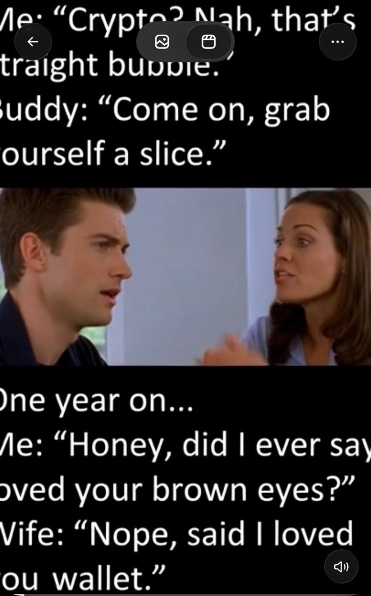 Me: “Crypto? Nah, that’s straight bubble.” Buddy: “Come on, grab yourself a slice.” One year on… Me: “Honey, did I ever say I loved your brown eyes?” Wife: “Nope, said you loved my wallet.” ID: 339683272